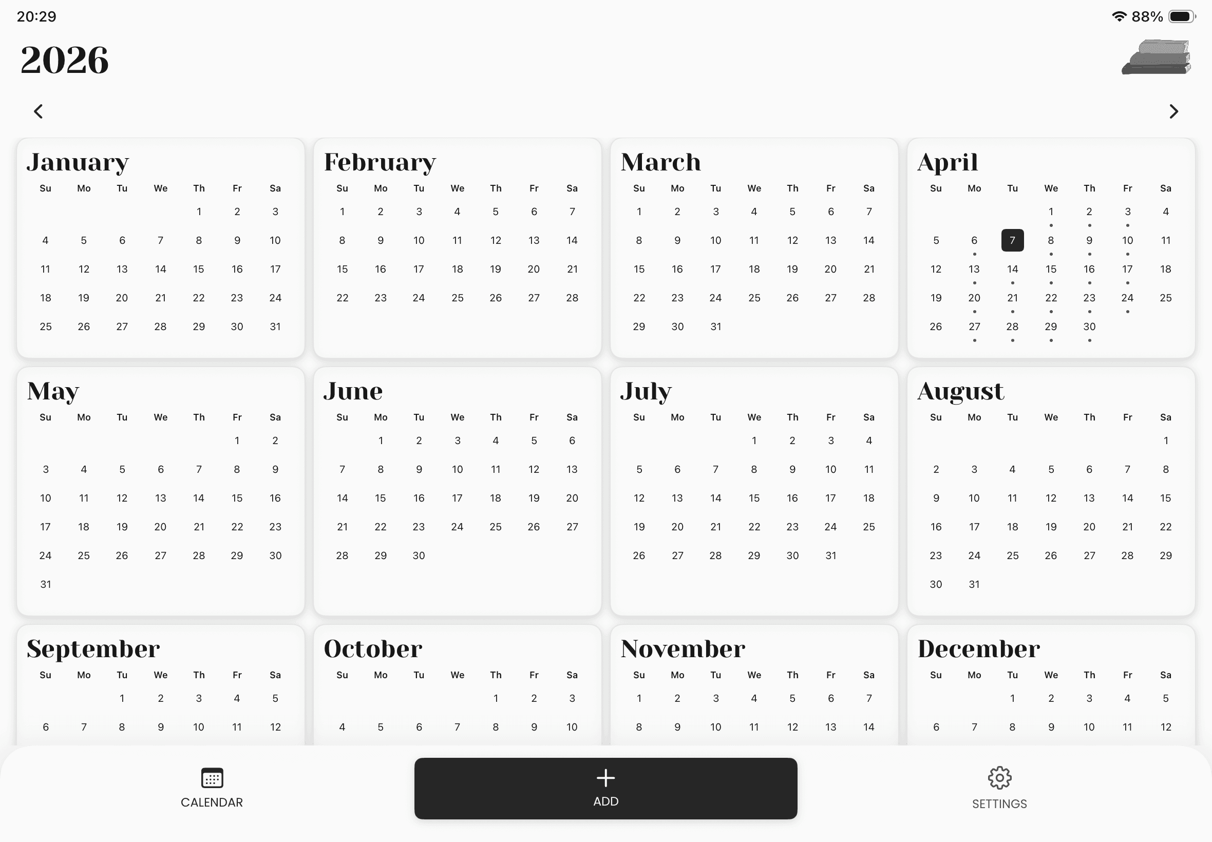 Connect your existing Apple and Google Calendars and keep everything in sync. On Pro, search for public calendars right inside the app and link them instantly — sports schedules, public holidays, local events and more, no copying links required.