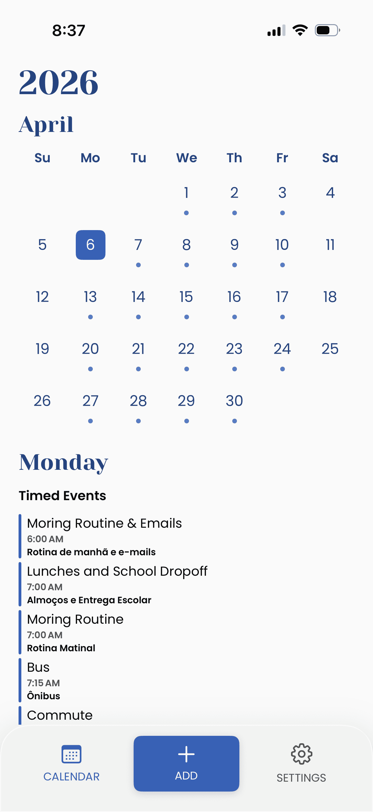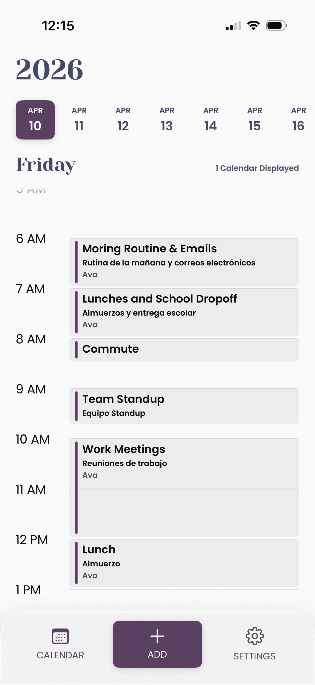 Whether you're learning a new language, living between two cultures, or just prefer seeing your day in two languages at once — CallyList displays your events bilingually right in the calendar. Add the widget to your home screen for an at-a-glance view that keeps both languages front and centre, all day long.